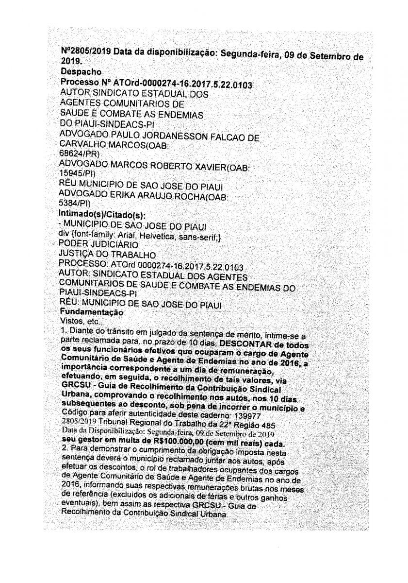 Conforme despacho referente ao Processo nº ATOrd-0000274-16.2017.5.22.0103 no qual o município de São José do Piauí - PI deverá DESCONTAR de todos os seus funcionários efetivos que ocuparam o cargo de Agente Comunitário de Saúde e Agente de Endemias do ano de 2016
